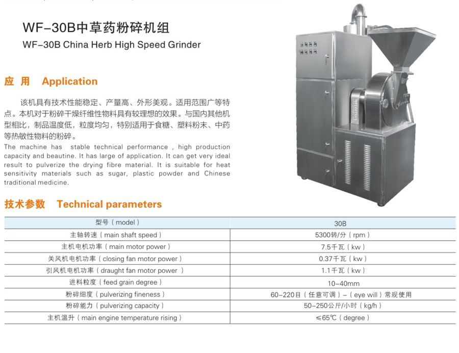 该机具有技术性能稳定、产量高、外形美观。适用范围广等特点。本机对于粉碎干燥纤维物料具有理想的效果。与国内其他机型相比,制品温度低,粒度均匀,特别适用于食糖、塑料粉末、中药等热敏性物料的粉碎。